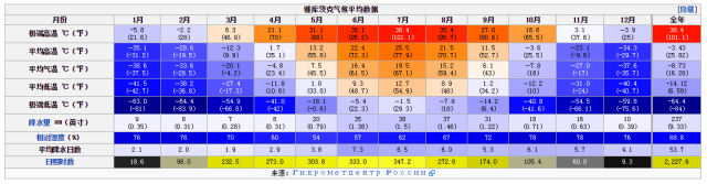 雅庫茨克距北冰洋極近,1月份的平均氣溫為零下40.9度,而7月份的平均氣溫為18.7度。全城建在堅如巖石的永久凍土上面,但表面1.2米厚活動土層冬凍夏融,木樁必須深深紮入活動土層之下,將房屋建在離地1米的樁上,以免土地溶融,毀了建築物。