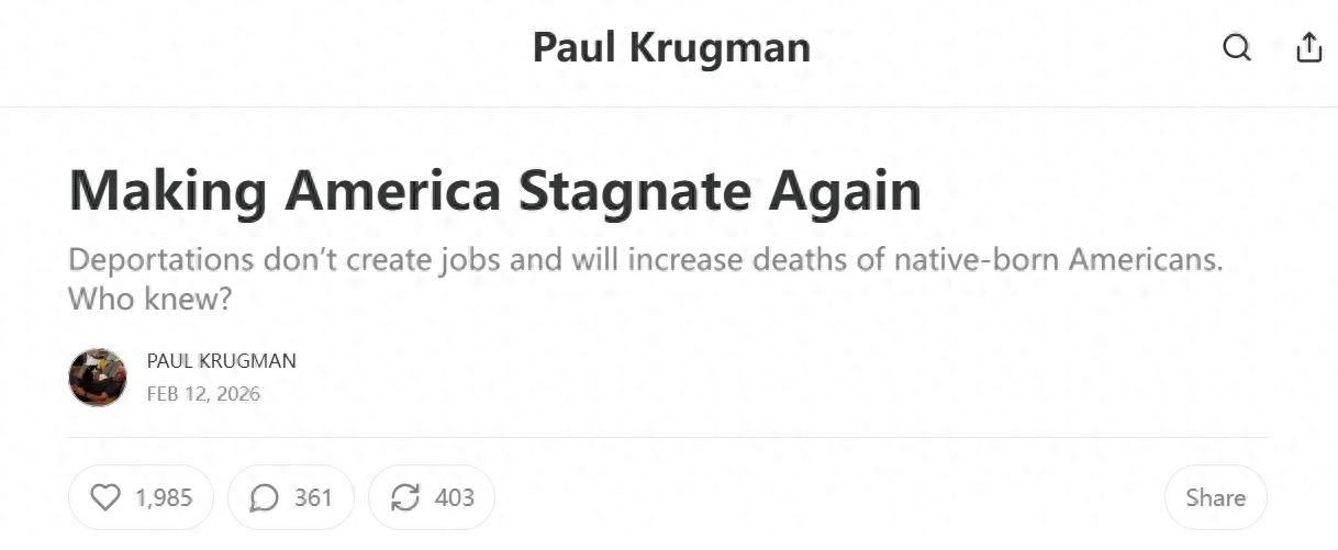 克魯曼的文章點出了美國經濟學家一直批評的問題:川普政府在移民政策上的重大謬誤。此前,多名經濟學家都強調,大量遣返美國的移民只會導緻美國經濟陷入困境。